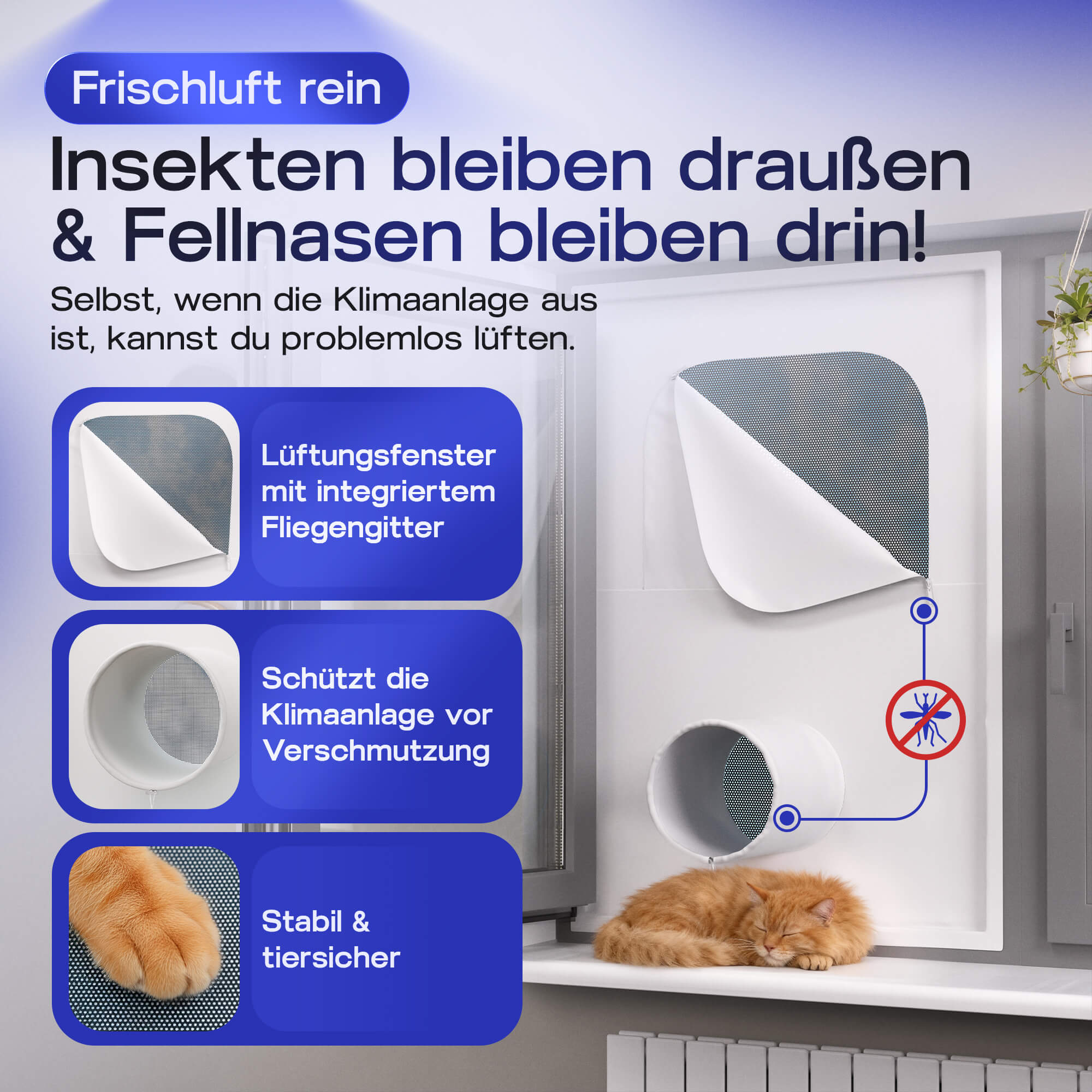 Unser Mückengitter ist bewusst sehr robust und für den dauerhaften Einsatz im Alltag ausgelegt. Es handelt sich um ein gummiertes, fest vernähtes Gitter, das deutlich widerstandsfähiger ist als einfache, dünne Insektengitter. Durch die gummierte Oberfläche bleibt das Material formstabil, franst nicht aus und reißt nicht so leicht, selbst wenn es regelmäßig genutzt oder leicht belastet wird. Das Mückengitter ist sowohl im oberen Lüftungsfenster als auch im unteren Bereich der Schlauchaufnahme integriert. Dadurch bleibt der Raum beim Lüften zuverlässig vor Insekten geschützt, gleichzeitig wird verhindert, dass Haustiere wie Katzen über die obere oder untere Öffnung nach draußen gelangen. Zusätzlich schützt das Gitter im Bereich der Schlauchöffnung das Klimagerät vor Verschmutzungen.
