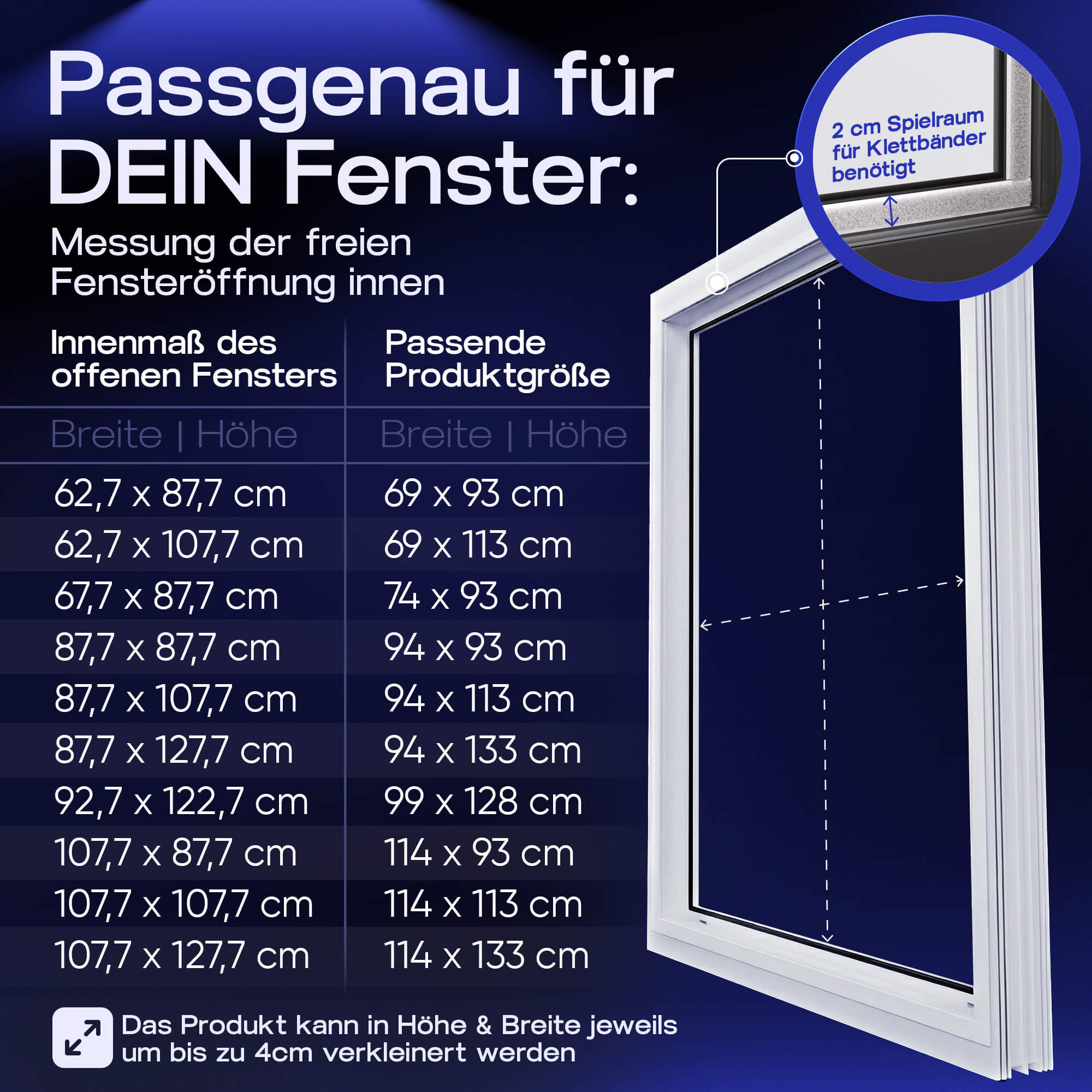 Zwischen dem Klettband, das sich direkt an der Fensterabdichtung befindet, sind sowohl in der Höhe als auch in der Breite auf jeder Seite jeweils zwei kleine Lücken vorgesehen. An diesen Stellen kann der Stoff bei Bedarf leicht geknickt werden. Auf diese Weise lässt sich die Fensterabdichtung in Höhe und Breite jeweils um bis zu maximal 4 cm verkleinern, um sie besser an kleinere Fensteröffnungen anzupassen. Ist die gemessene Fensteröffnung hingegen größer als angegeben, besteht keine Möglichkeit zur Anpassung. Die Fensterabdichtung besteht aus einem sehr robusten, formstabilen Material, das sich nicht ziehen oder dehnen lässt, um eine größere Fläche abzudecken. Die in der Größentabelle angegebenen Maße stellen daher immer die maximalen Fensteröffnungen dar, die mit der jeweiligen Produktgröße zuverlässig abgedichtet werden können.