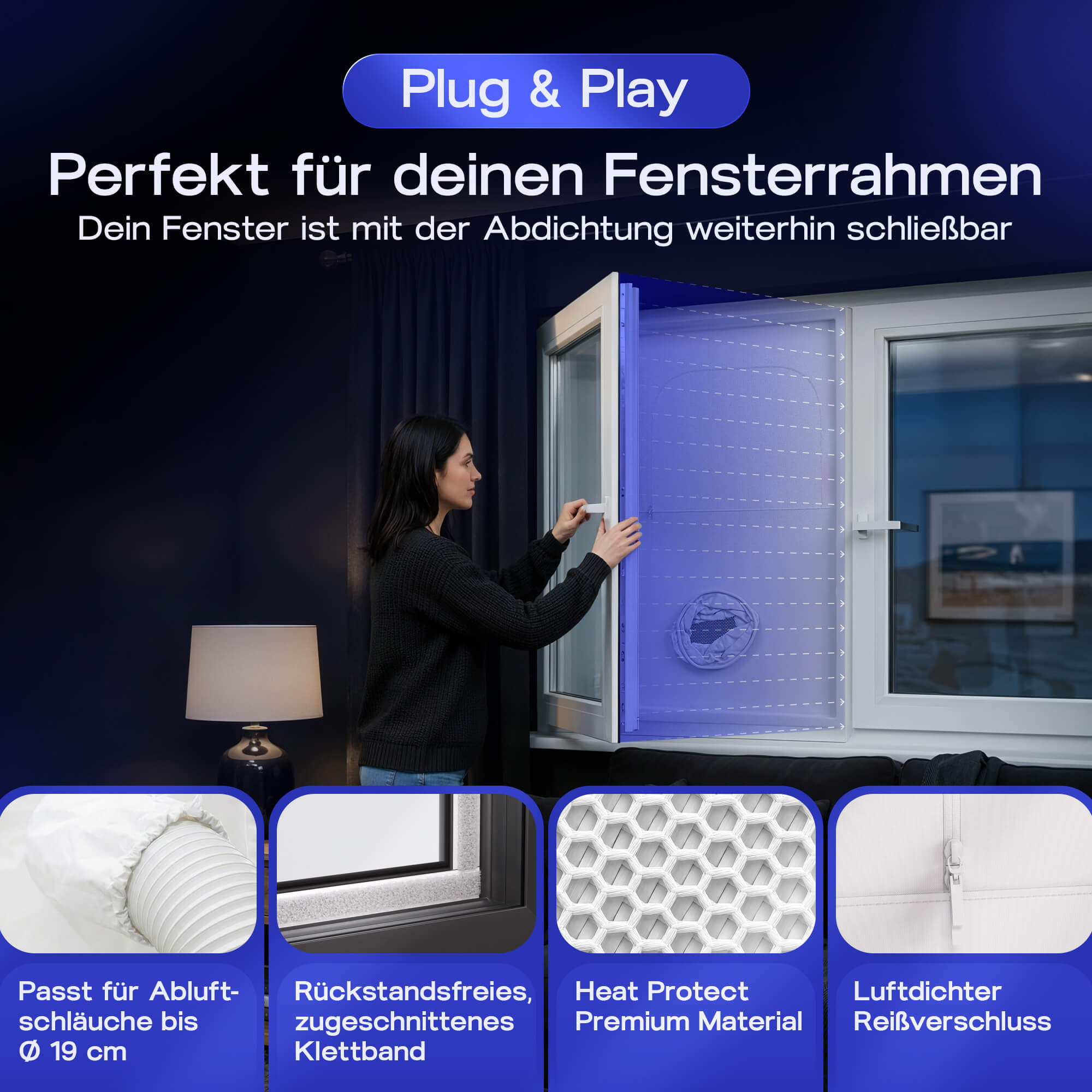Du kannst sie jederzeit aus dem Fenster entfernen und später erneut einsetzen. Dank des Plug and Play Systems lässt sie sich mit wenigen Handgriffen wieder anbringen, ohne dass du etwas zuschneiden oder nachjustieren musst. Das ist ideal, wenn du die Klimaanlage nur saisonal nutzt oder die Abdichtung zwischendurch entfernen möchtest.